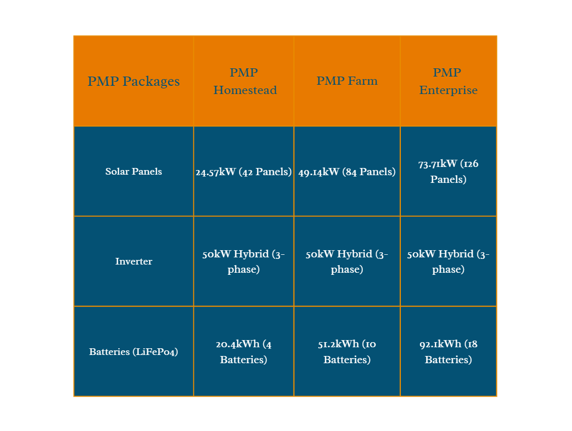 PMP Homestead (inc. 20.44kWh batteries) PMP Farm (inc. 56.32kWh batteries) PMP Enterprise (inc. 92.16kWh batteries)